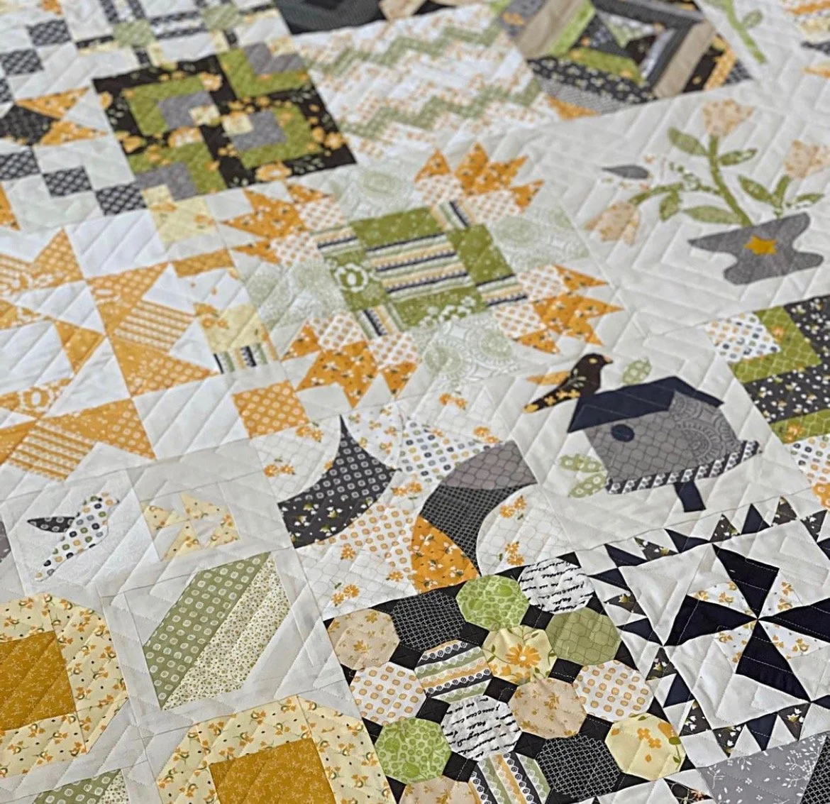 This was also the first quilt that I decided to quilt with an Edge-to-Edge design. At that time I didn’t have my own machine and had the quilting done locally in Melbourne by The Quilt Room who did an excellent job on finishing this quilt. The backing was also a wide-back fabric (108” Wide). Unfortunately, I don’t like the backing now that it is quilted. Although it is from the same designer and company, it is sateen and shinier and heavier than standard quilting cotton. The fabric used for the quilt top is mostly Corey Yoder’s Pepper and Flax collection. Would you believe that I started my blocks with a charm pack? Added a layer cake and quite a few random fat quarters to round out and have enough fabric.